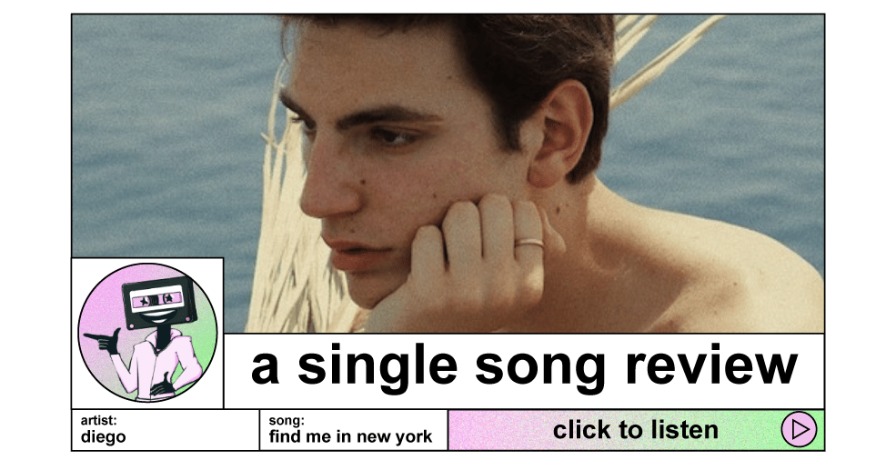 got a real sweet lil song for you this week. and from a superrrr underground artist too, which is ticking a lot of boxes for this lil newsletter. it’s got a ton of great flair and song writing chops, while remaining a really sweet song. this is find me in new york by an artist called diego, and it’s brought to you by the absolute banger factory that is the submitted songs list. got a song you want featured? get submitting! and in the meantime,