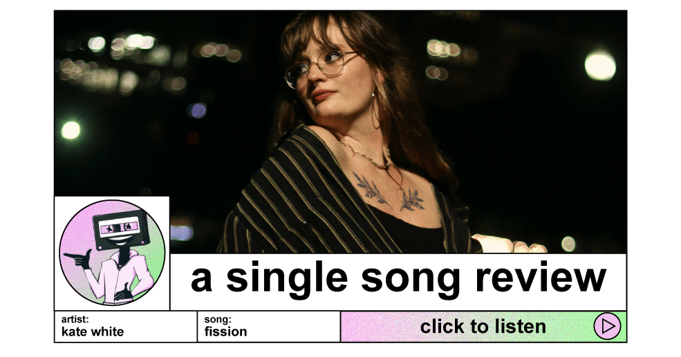 gonna be honest with you gang, the next 2 reviews (this one and the next oen) are going to be whistlestops, i am moving house and that means my life is rather up in the air atm! so, i’ve got a neat lil song for you, it’s barely 2 minutes long, and it’s really sweet. it uses some neat effects, has a gentle lo fi production to it, and i think it’s pretty neat. sent in by a subscriber too! meet kate white, and her song, fission.