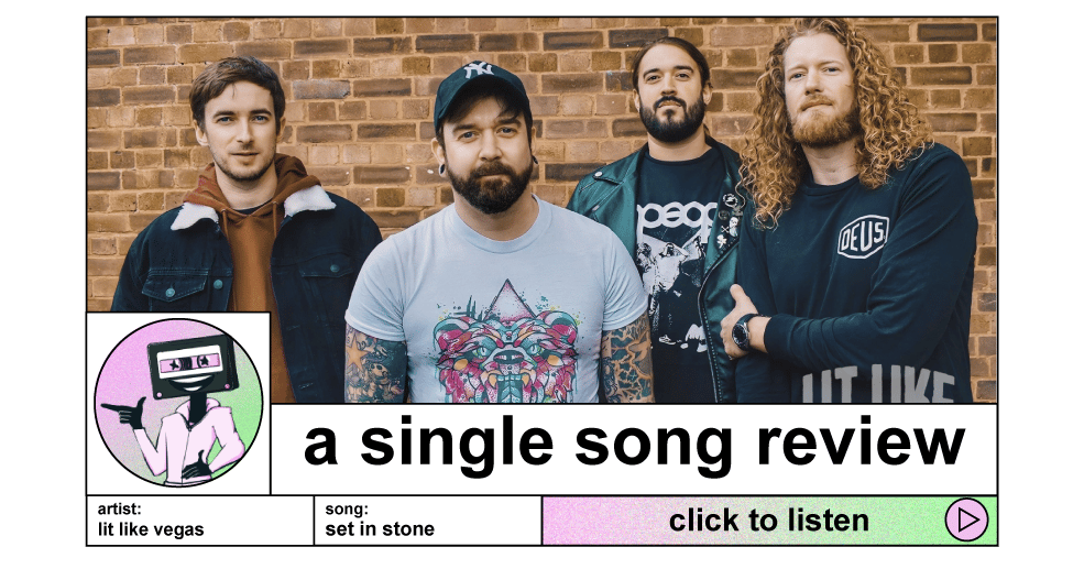 we’re doing on a little trip down memory lane here with this weeks song. we’ve got a good old fashioned, fresh from the early/mid 00’s post hardcore and or metalcore and or other core track. honestly it’s been a bit of a hot second since we took a look at a song like this, and this is a pretty good one. it’s got your classics, from a guitar solo to a combo of screamed and sang lyrics and a super catchy chorus. it goes a hundred miles an hour and i think it’s pretty neat. meet lit like vegas and their song set in stone, this weeks premium review!