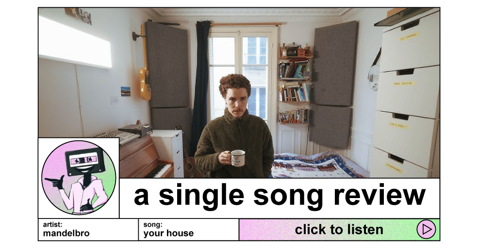 hello good morning and welcome to another edition of a single song review, this week we’re taking a look at someone doing an odd lil indie excursion with a really unique and excellent sound. meet mandelbro, indie band, moustache owner and this weeks artist who tackles the indie singer with guitar genre by planting two feet on either side of uniqe and generic and daring to do it a lil bit of both ways. this examplem the song your house which came out this past january, and really rules.
