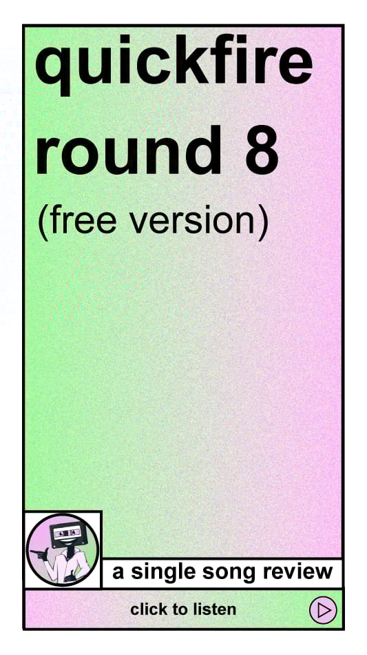 for those not in the know, quickfire rounds are round ups of all the extra tracks i’ve been recommending to you, all in one place. well, not quite in one place, this is half of them. the other half? they’re in another playlist for premium users. want it? upgrade your subscription! it helps keep the lights on in this here newsletter, keeps things rolling and you get extra goodies like more playlists. in fact, play your cards right and you’ll get double the playlists this week, how neat!