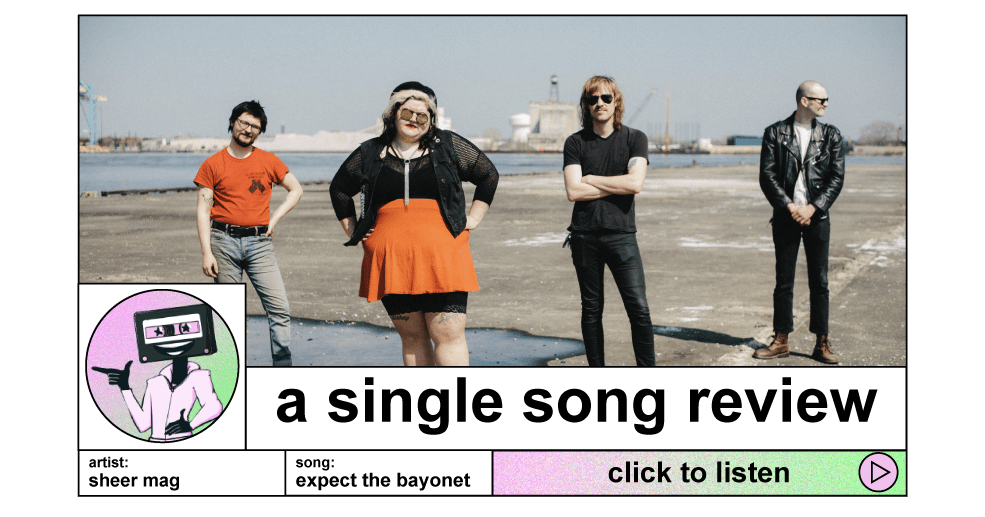sometimes the trickiest part of these reviews is the first few words. what do you go with? start with a lil jokey joke? a hello? a who goes there! or maybe you just dive in with a lil story. whatever you’re doing, you can expect you’ll get some kind of response. one other thing you can count on is you can expect the bayonet. the song, this weeks song, we don’t do actionable threats, just songs by bands and artists. like sheer mag, writer of this weeks song.